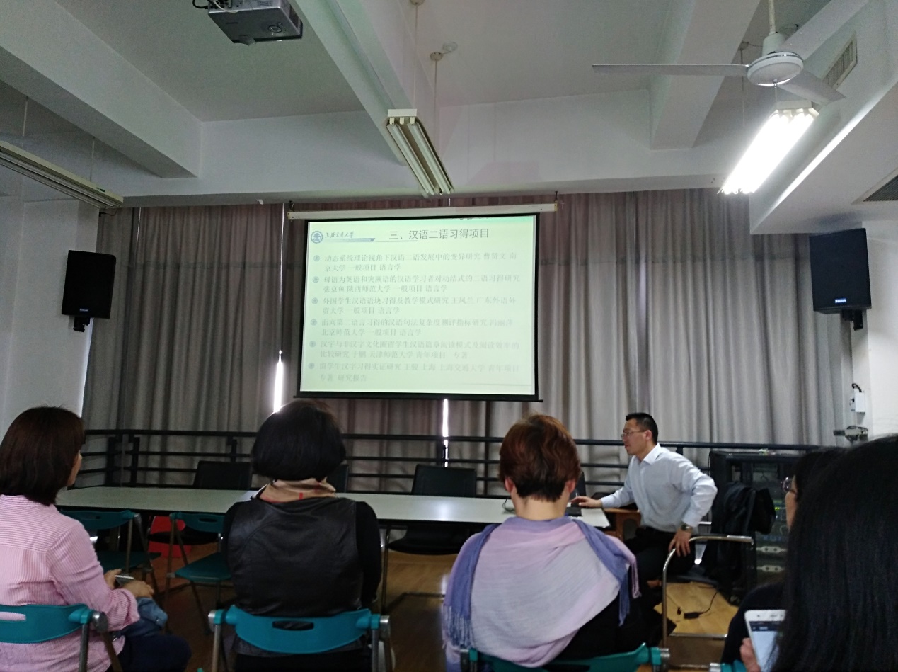 讲座伊始,赵经理向在场师生简单介绍了常教授,全场报以热烈的掌声。接着,常教授围绕主题,梳理历年来有关汉语二语研究的国家社科基金项目和教育部人文社科基金项目,结合本人主持的国家社科基金青年项目、重点项目以及教育部人文社科基金青年项目,探讨社科项目的选题、项目书的撰写、项目的实施与结项等。常教授指出,做研究要依照“跟跑—并跑—领跑”的路线,在前人的基础上创立自己的新角度,引领学科发展。常教授还结合自身经历,鼓励员工积极培育学术精神,指导老师正确从事科研创作。