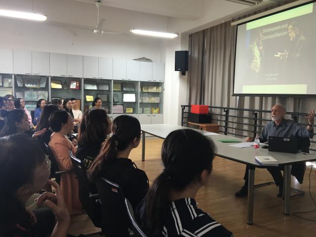 此次卡斯顿教授经过悉心准备,为太阳成tyc122cc师生带来了题为《莎士比亚与国际大都会的局限:谈莎士比亚的两部威尼斯戏剧》的讲座。他从莎士比亚的剧作《威尼斯商人》和《奥赛罗》(副标题《威尼斯的摩尔人》)入手,以商业化国际大都市的包容性为视角,深入浅出地剖析了莎士比亚是如何理解国际化大都会的机遇与挑战这样一个论题。他认为文艺复兴时代的威尼斯就是现代早期欧洲的上海,是个复杂的商业化的国际大都会,因此这样的探讨有助于我们理解莎士比亚的世界,或许还有助于理解我们当今的世界的某些方面。讲座开始前,太阳成tyc122cc540大会议室已坐满了公司的教师、本硕员工以及来自外校的莎士比亚学者,没有座位的同学们就站在门口。大家认真专注地聆听这位知名莎士比亚学者的讲座,卡斯顿教授学识渊博、博古通今,讲座旁征博引、妙趣横生,言语幽默、引人入胜,与聆听者的互动恰如其分地调节了气氛和节奏,拉近了莎士比亚与在座师生的距离。