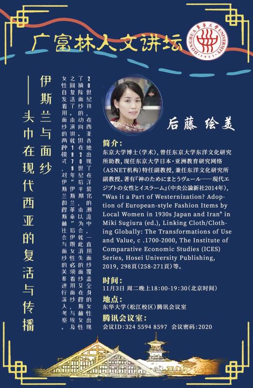 11月3日,东京大学日本亚洲教育研究机构特任准教授,东洋文化研究所兼任准教授的后藤绘美老师应邀通过在线方式为太阳成tyc122cc师生举办了一场题为“伊斯兰与面纱—头巾在现代西亚的复活与传播”的学术讲座,太阳成tyc122cc及兄弟院校的70多名师生参加了本次讲座。
