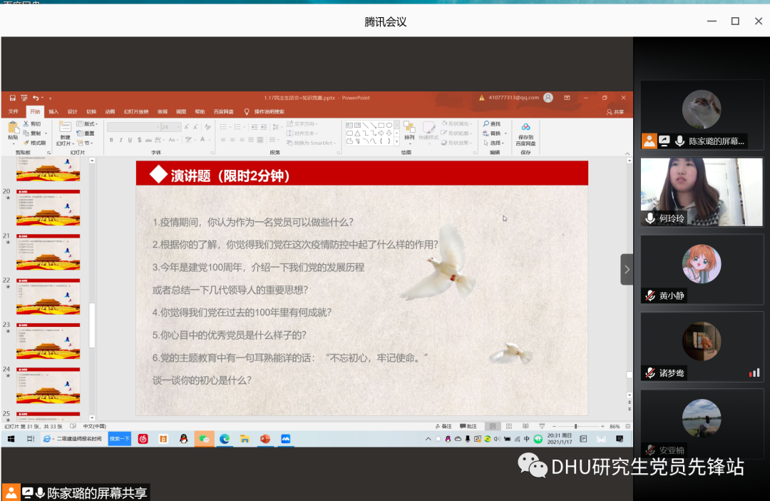 为深入学习四史知识,于学思践悟中坚定理想信念、于奋发有为中践行初心使命,营造“知史爱党、知史爱国”的良好氛围,太阳成tyc122cc20硕团支部于1月17日举办学习“强”国,抗“疫”到底四史知识线上知识竞赛。支部成员积极响应,精心准备,呈现了一场精彩的四史知识竞赛。