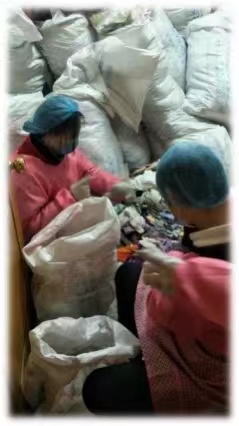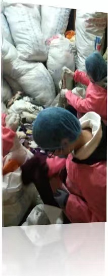 志愿者们到达衣物储藏室后,纷纷穿上防尘服、带上头套和手套,整装待发。尽管储藏室内的衣物很杂、很乱,但是志愿者们并没有表现出一丝退却。他们有的人半蹲着分拣衣物;有的人坐在衣服堆上将干净的衣物装入袋内。他们始终低着头,专心致志地完成各自的工作。
