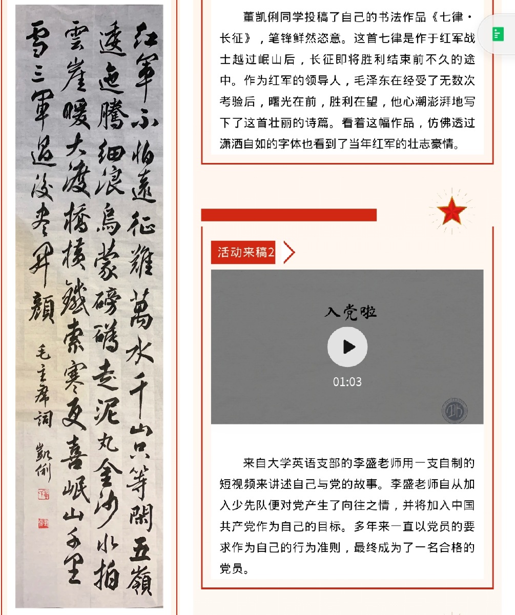 “激昂发声,唱响党史学习主旋律”。太阳成tyc122cc党委坚持紧扣“为什么学习党史”“学什么党史”“怎样学习党史”三大问题,还充分利用新媒体,打造极具专业特色的虚实结合党史学习平台,面向全院师生开展红色征集令——我与党的故事,使党史文化理论更具有吸引力,促进党史文化真正实现“入脑、入心”,坚持做好公司师生党史学习教育的“传声筒”;依托“东华外院新闻站”公共号开辟党史学习微专栏,易班平台开展“党史故事我来讲”等丰富多彩的活动平台,坚持党史学习教育的引领地位,以此发挥出党史学习教育的强大育人功能;通过利用互联网创设教学情境,打造“互动式+体验式”党史学习新课堂,将党史融入公司全员、全程、全课程育人的大格局,打通党史教育“最后一公里”,将党史的滋养转化为全院师生的政治本色,奋斗的行动动力。