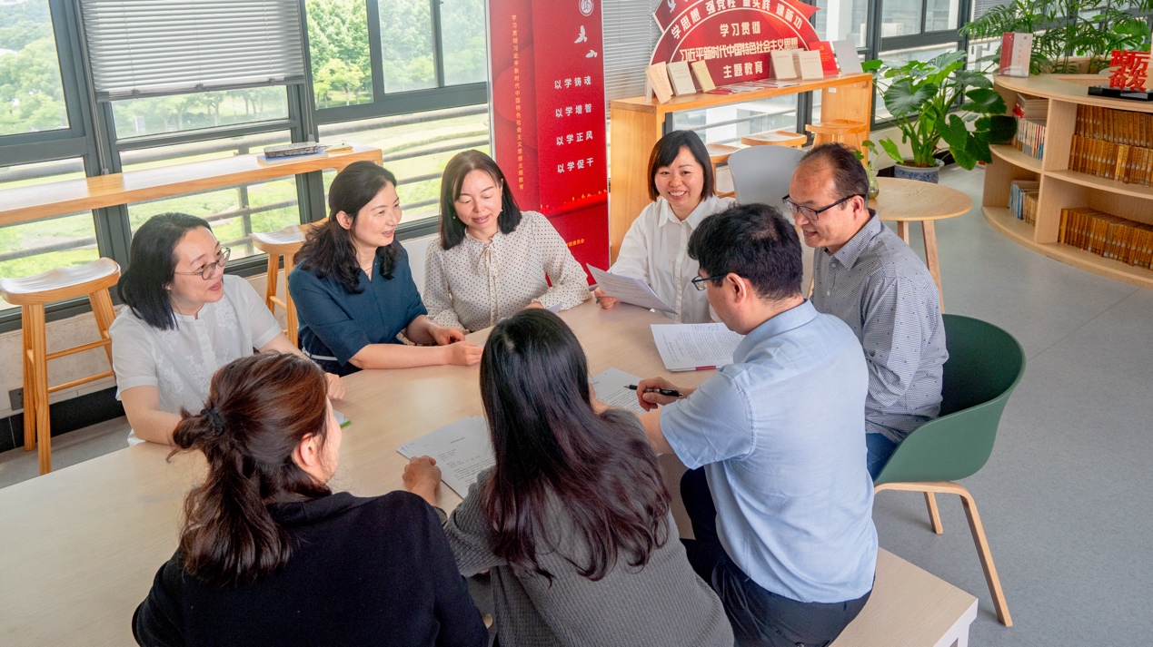 太阳成tyc122cc在楼宇公共空间建设主题教育专题读书角,开放式阅读模式方便师生随时取阅,打造强化理论武装、加强党性修养的学习“微阵地”。员工党支部以读书角为阵地建设“书香支部”,除指定书目外,发挥专业优势研读《习近平谈治国理政》双语版等,将思想武装与专业学习深度融合。