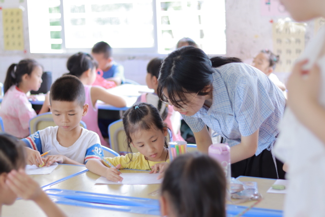 (支教团成员为小朋友教授英文)