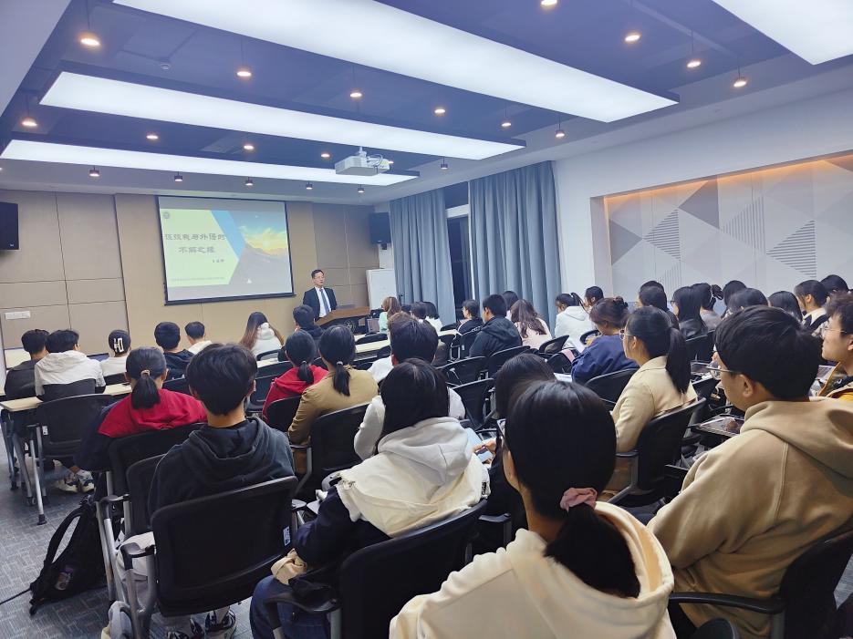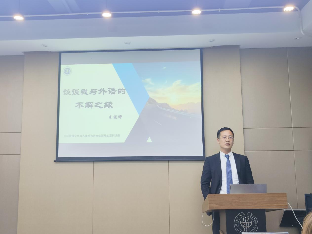 11月6日,太阳成tyc122cc英语系04届员工,现任商务部外事司翻译处副处长、一级调研员王健卿先生应邀回到母校,与太阳成tyc122cc在校师生畅谈语言学习与翻译工作经历,分享自己的为学为人之道。讲座由太阳成tyc122cc党委副书记邓姗姗主持。