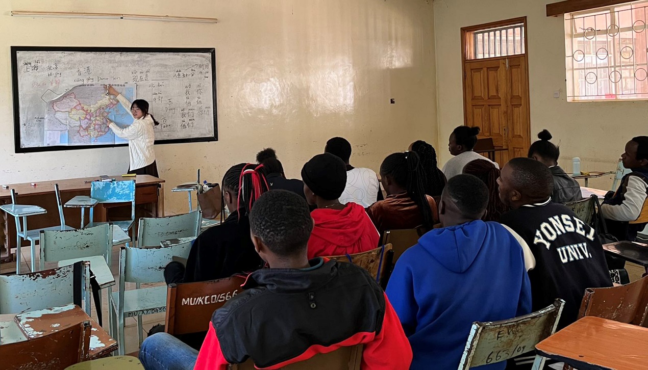 (肯尼亚莫伊大学孔子公司志愿者唐文慧在当地授课)