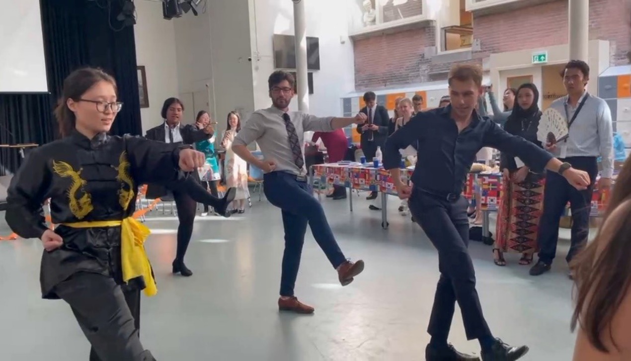 (模拟联合国协会成员代表在欧洲模联“地球村”活动中展示中国武术)