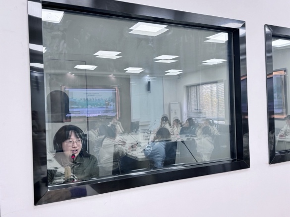 随后,张老师邀请员工走进了同声传译的核心场所——“同传booth”,让大家切身体验译员在小间中快速工作的真实状态。员工在booth中尝试进行简单的同声传译,练习在接收内容的同时,迅速转换语言表达,由此体验到同声传译中的紧张和高效,并深切体会到沟通之桥在文化与语言间的重要作用。